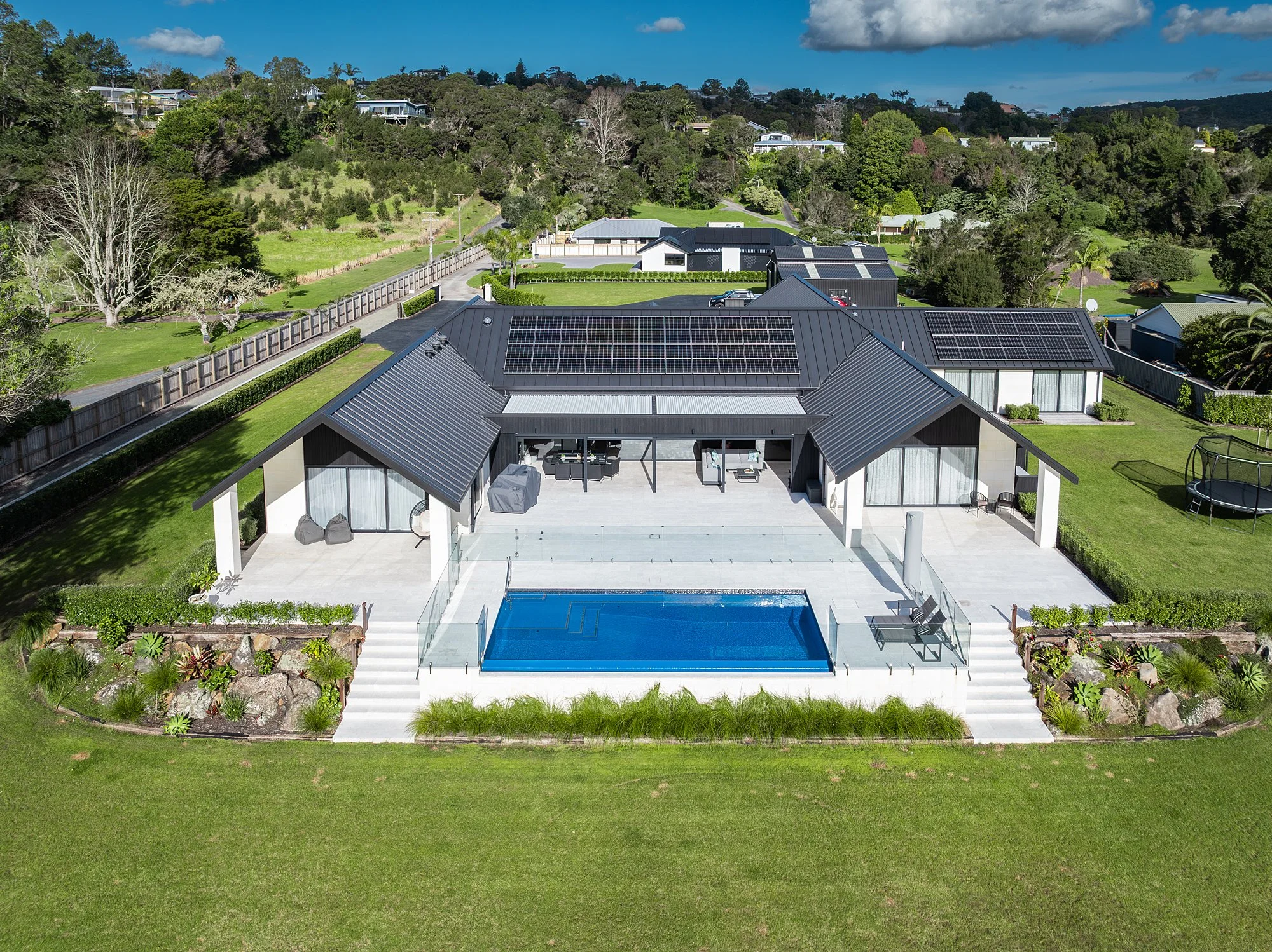 Set in front of the main outdoor living area, the pool sits comfortably within the deck, maintaining connections to the house while opening out to the surrounding grounds with a clean infinity edge.